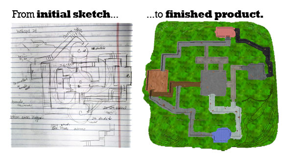 Base Wars’ level design was a front-loaded process, so the ROBLOX Content Team focused its initial efforts on implementing the capture-point mechanic through careful layout planning. What started as whiteboard drawings became a balanced, successful map through about 10 iterations – spanning everything from a sketch, to a single-texture layout used to determine the scale, to a version with identifiable bases and paths, to a final build with all the shortcuts, elevation changes and cover objects in place.