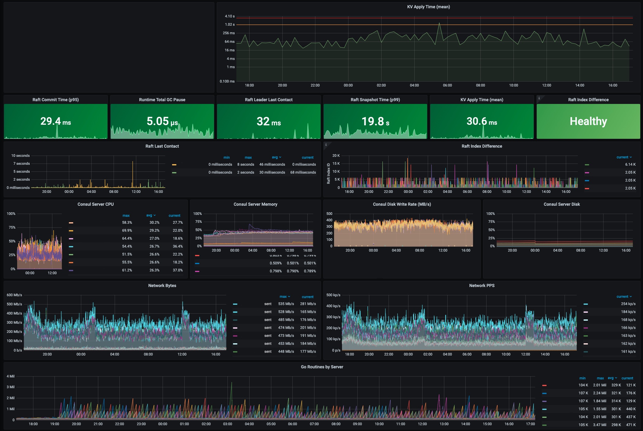 Given the severity of the incident, the team decided to replace all the nodes in the Consul cluster with new, more powerful machines. These new machines had 128 cores (a 2x increase) and newer, faster NVME SSD disks. By 19:00, the team migrated most of the cluster to the new machines but the cluster was still not healthy. The cluster was reporting that a majority of nodes were not able to keep up with writes, and the 50th percentile latency on KV writes was still around 2 seconds rather than the typical 300ms or less.
