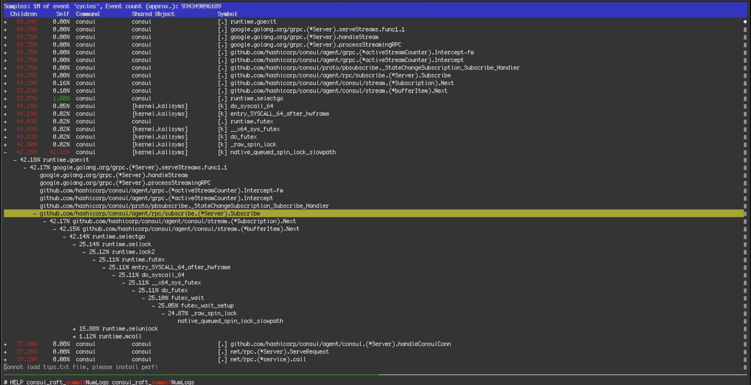 3. We then displayed this with a perf report as shown above. The majority of time was spent in kernel spin locks via the Streaming subscription code path.