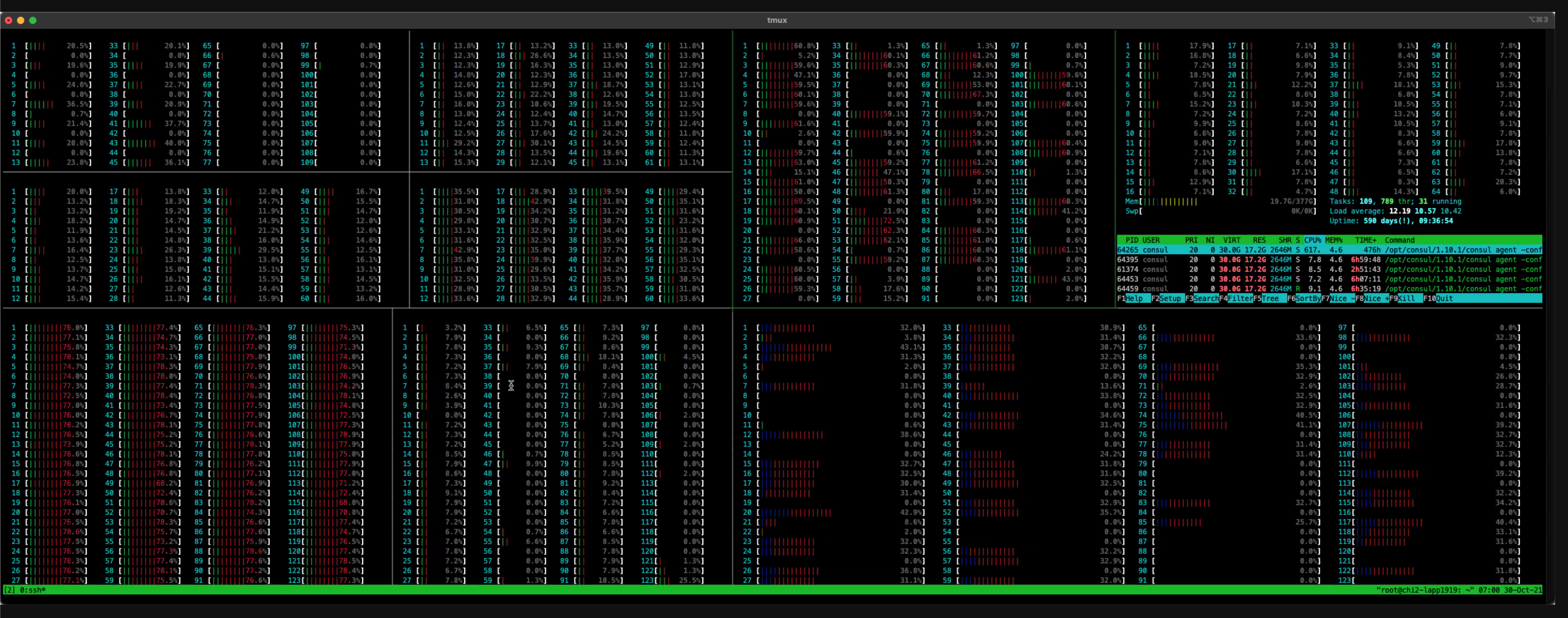 Over the next 10 hours, the engineering team dug deeper into debug logs and operating system-level metrics. This data showed Consul KV writes getting blocked for long periods of time. In other words, “contention.”The cause of the contention was not immediately obvious, but one theory was that the shift from 64 to 128 CPU Core servers early in the outage might have made the problem worse. After looking at the htop data and performance debugging data shown in the screenshots below, the team concluded that it was worth going back to 64 Core servers similar to those used before the outage. The team began to prep the hardware: Consul was installed, operating system configurations triple checked, and the machines readied for service in as detailed a manner as possible. The team then transitioned the Consul cluster back to 64 CPU Core servers, but this change did not help. This was our fourth attempt at diagnosing the root cause of the incident.
