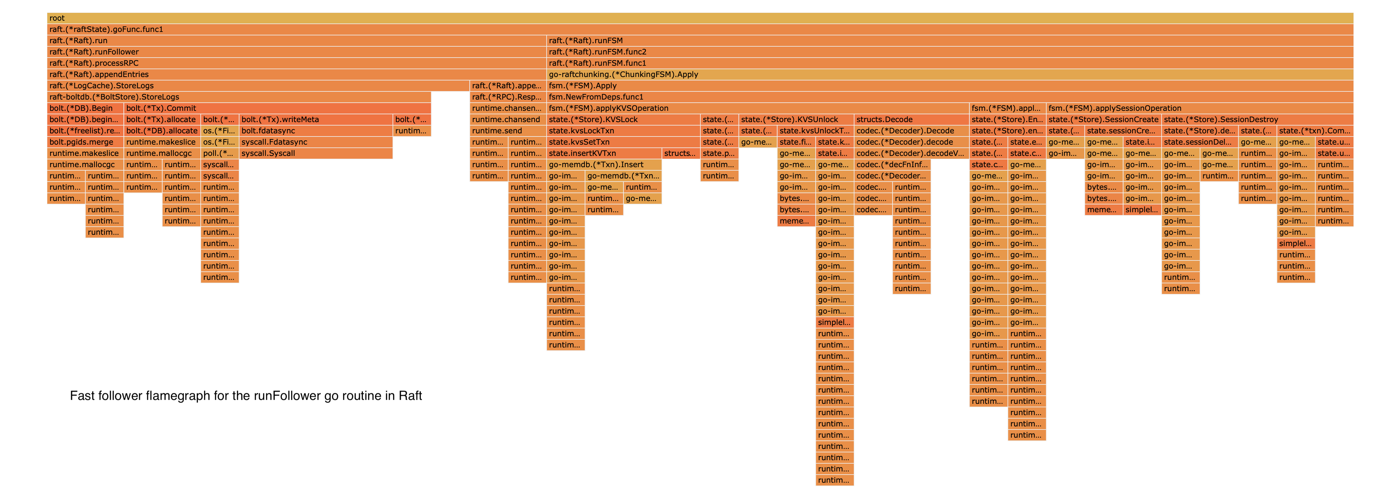 Further analysis of the slow leader problem also uncovered the key cause of the two-second Raft data writes and cluster consistency issues. Engineers looked at flame graphs like the one below to get a better understanding of the inner workings of BoltDB.